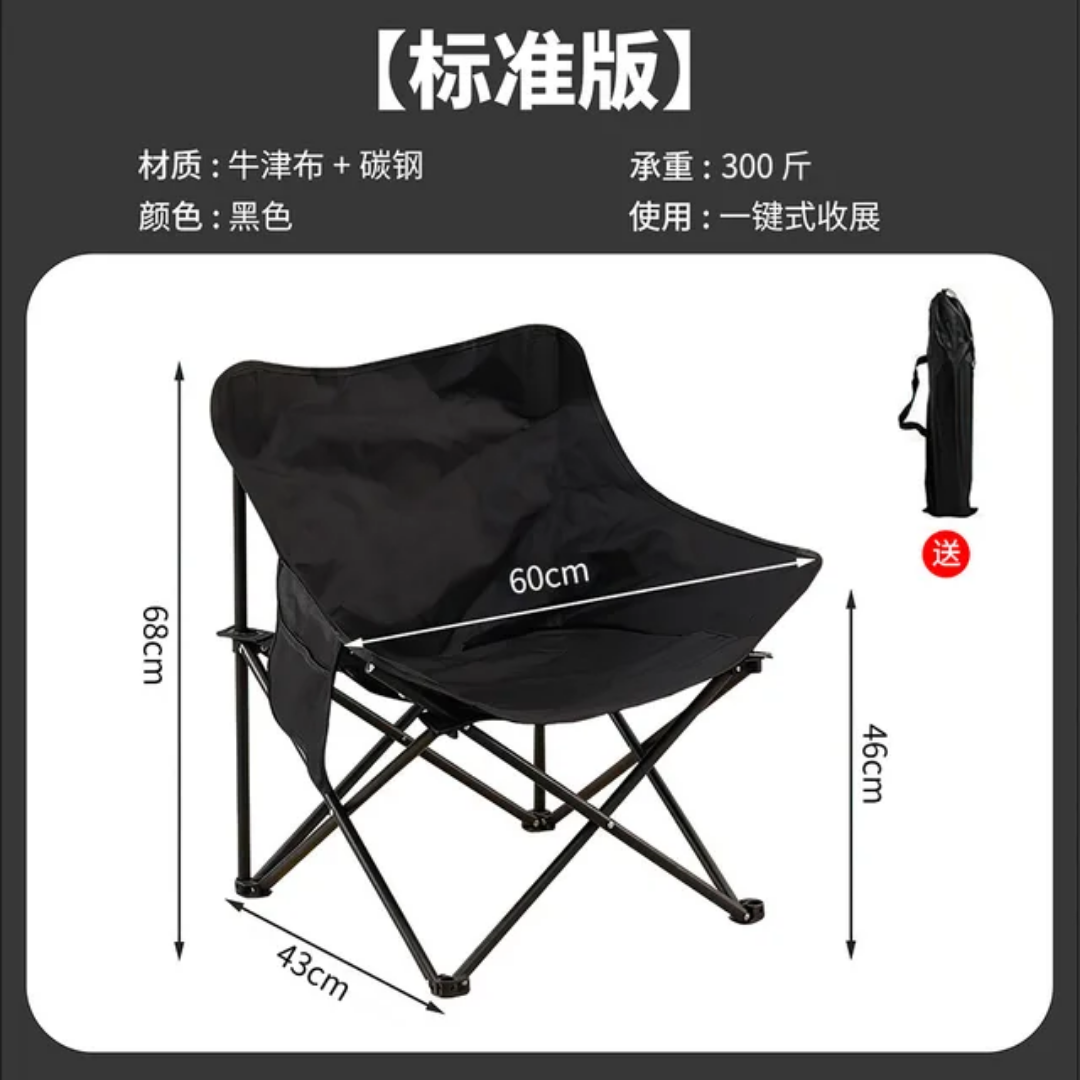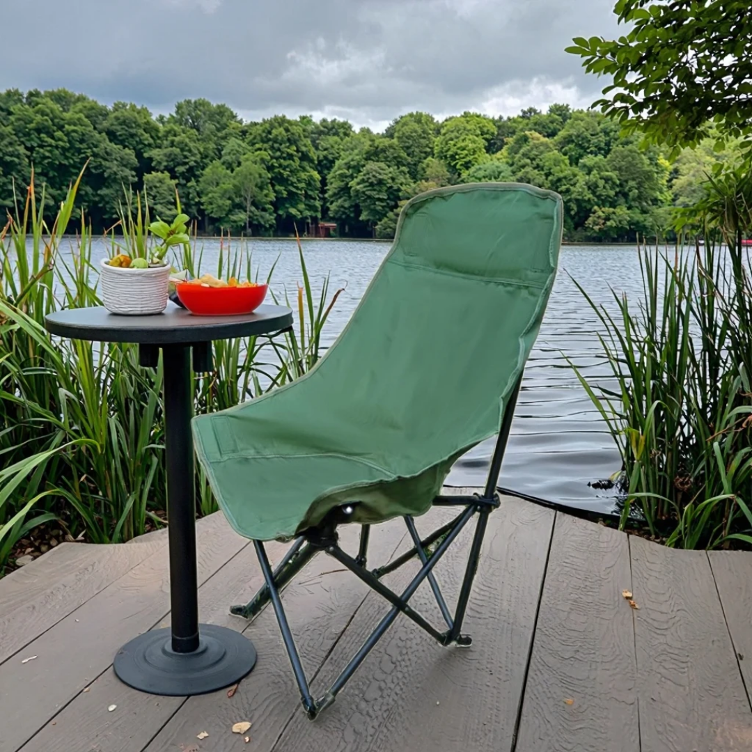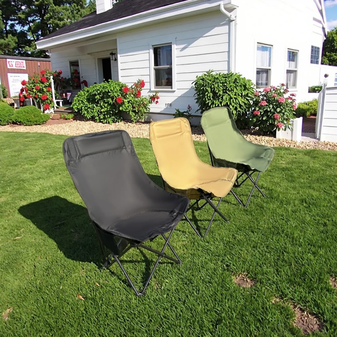 - Design Pliable et Compact : Se plie facilement dans un sac de transport (non visible mais implicite pour une chaise de camping), occupant un minimum d’espace.