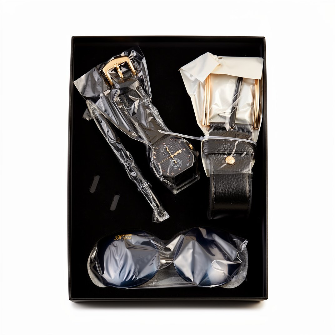 Coffret Business 4 en 1, »Montre à bracelet cuir, ceinture assortie, stylo lunette élégante. », » » »L’essentiel de l’élégance masculine réuni dans un coffret de prestige. » »