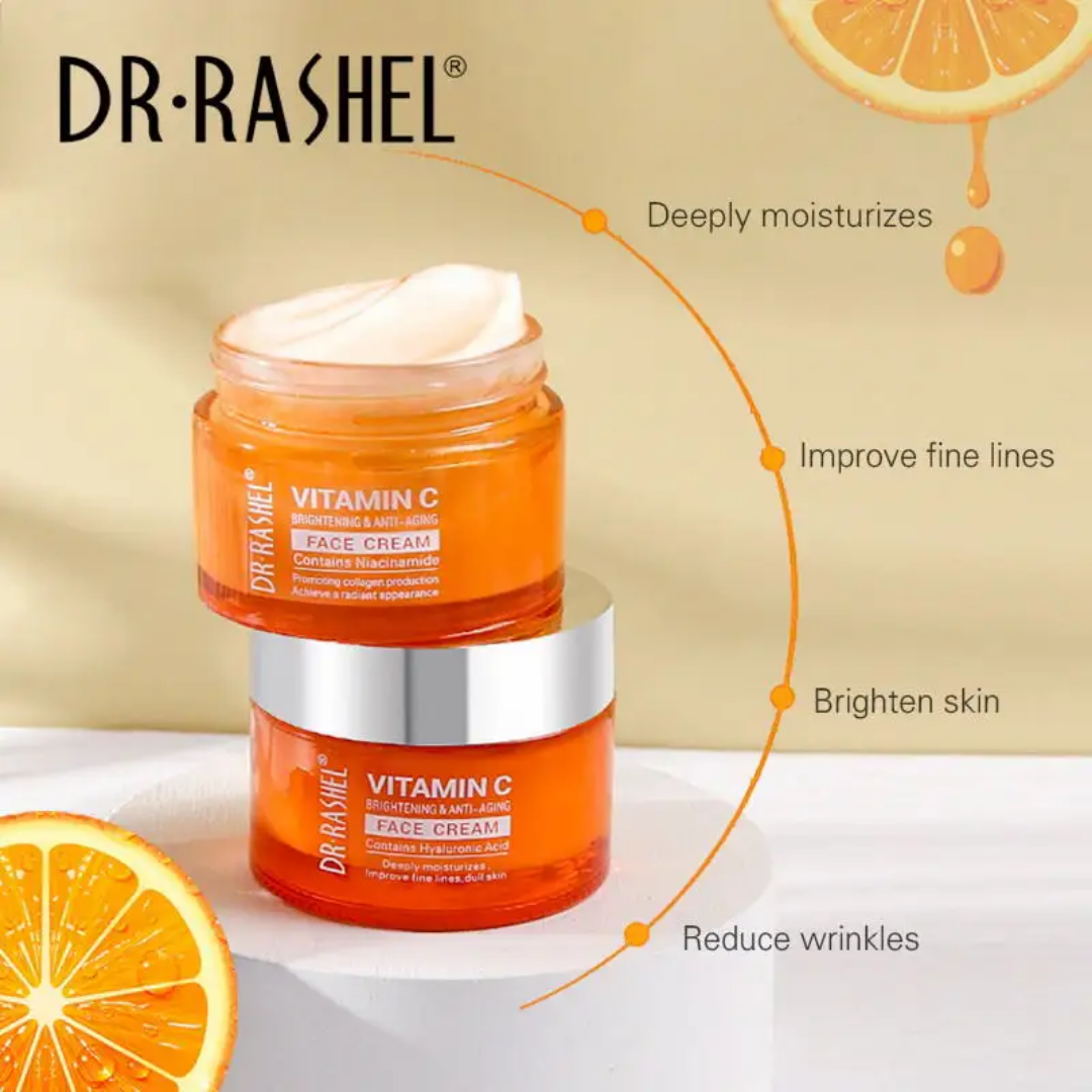 Crème Visage DR. RASHEL Vitamine C Éclaircissante Anti-Âge, Hydratante Profonde Niacinamide & Acide Hyaluronique, Réduit Rides et Ridules, Illumine le Teint, Stimule Collagène pour Peau Radieuse et Jeune