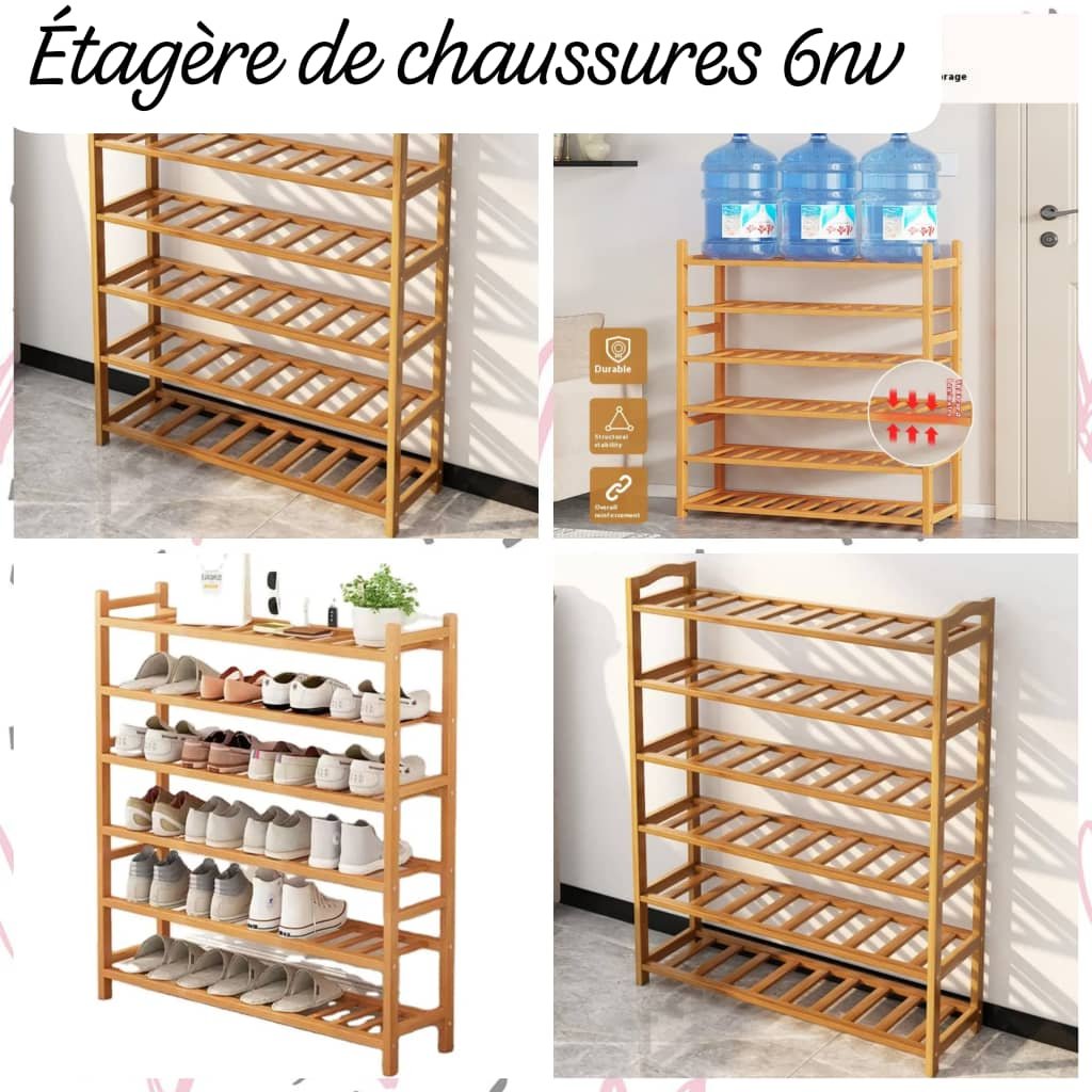 Pour le produit : Étagère à Chaussures en Bois Naturel 6 Niveaux, Meuble de Rangement Vertical Gain de Place pour Entrée et Couloir, Organisateur Robuste et Modulable pour une Maison Ordonnée