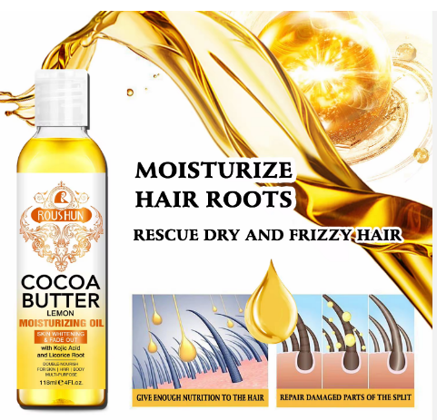 Pour le produit : Huile Hydratante Éclaircissante ROUSHUN au Beurre de Cacao et Citron, Anti-Taches et Unifiante, Soin Multi-Usages pour Peau, Cheveux et Corps, Formule Riche en Acide Kojique et Racine de Réglisse, Nourrissante et Réparatrice, 118ml