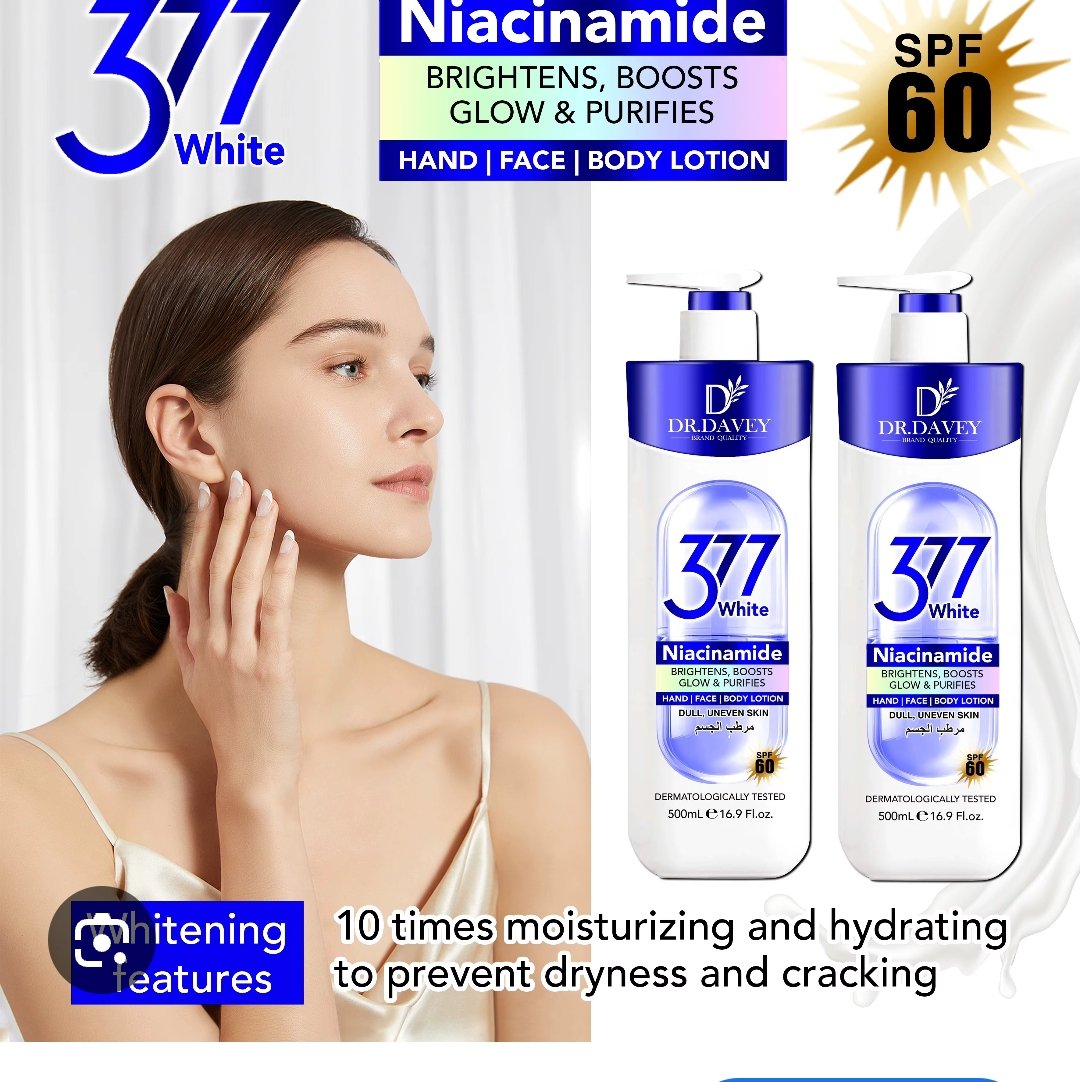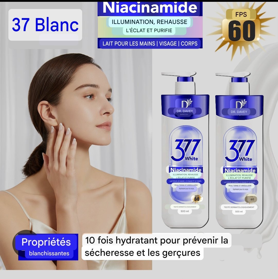 Pour le produit : Lait Corporel à la Niacinamide 377 White conçu pour hydrater et unifier le teint. Il contient de la niacinamide connu pour sa capacité à réduire les imperfections et à améliorer l'éclat de la peau.