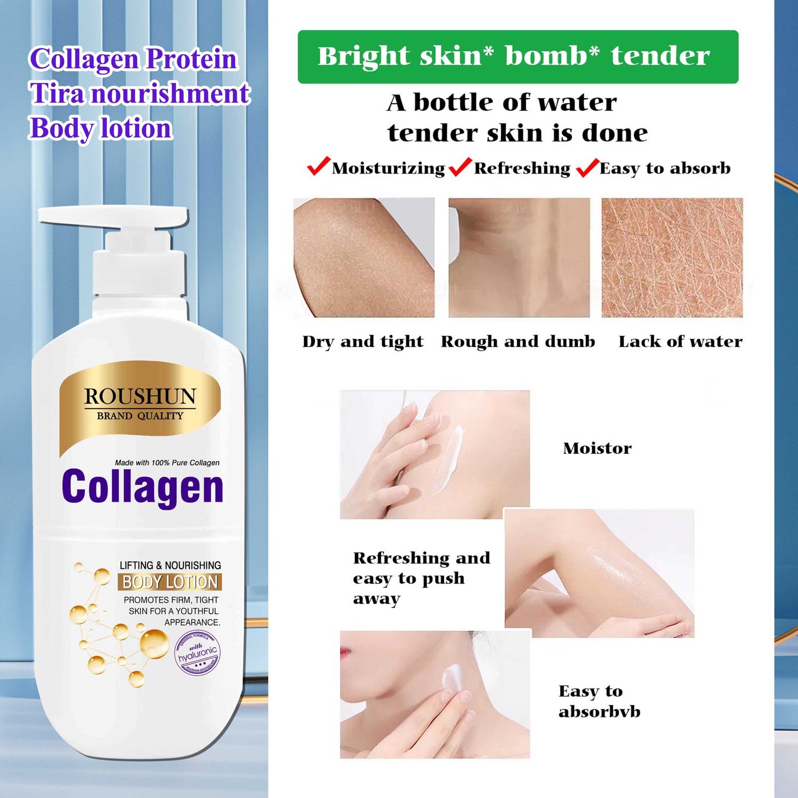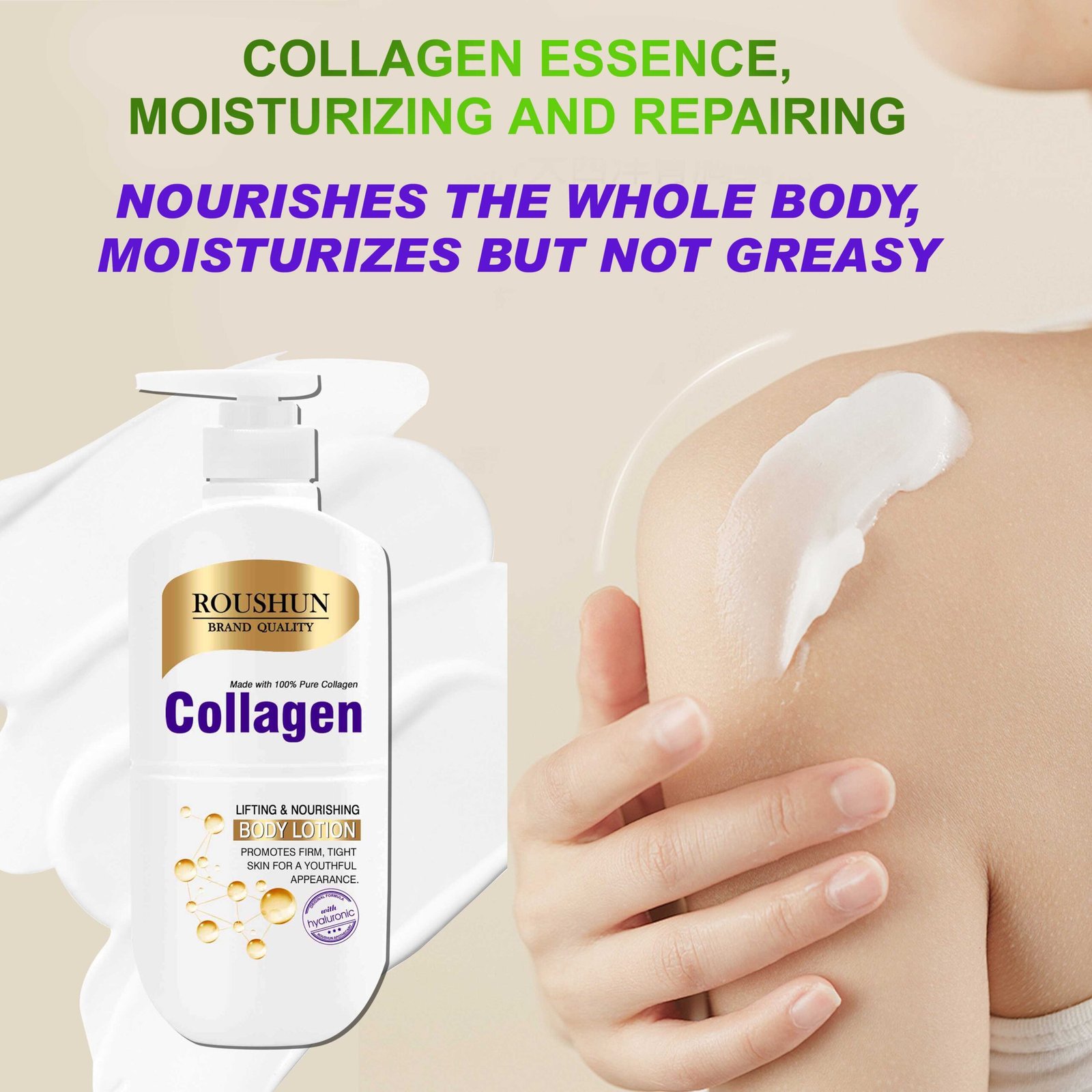 Pour le produit : Lotion Corporelle Raffermissante au Collagène ROUSHUN, Soin Hydratant Anti-Âge avec Vitamine E, Réduit Rides et Ridules pour une Peau Jeune et Éclatante, Émulsion Nourrissante et Liftante Flacon Pompe