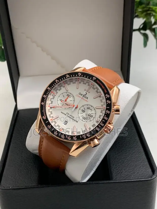 Pour le produit : Omega Speedmaster Co-Axial Chronograph. Ce modèle particulier se distingue par son boîtier en or rose (ou alliage similaire), un cadran blanc avec des accents rouges et un bracelet en cuir marron. Cette montre est une réinterprétation de l'Omega Speedmaster, inspirée par la collaboration légendaire entre Omega et Swatch connue sous le nom de MoonSwatch