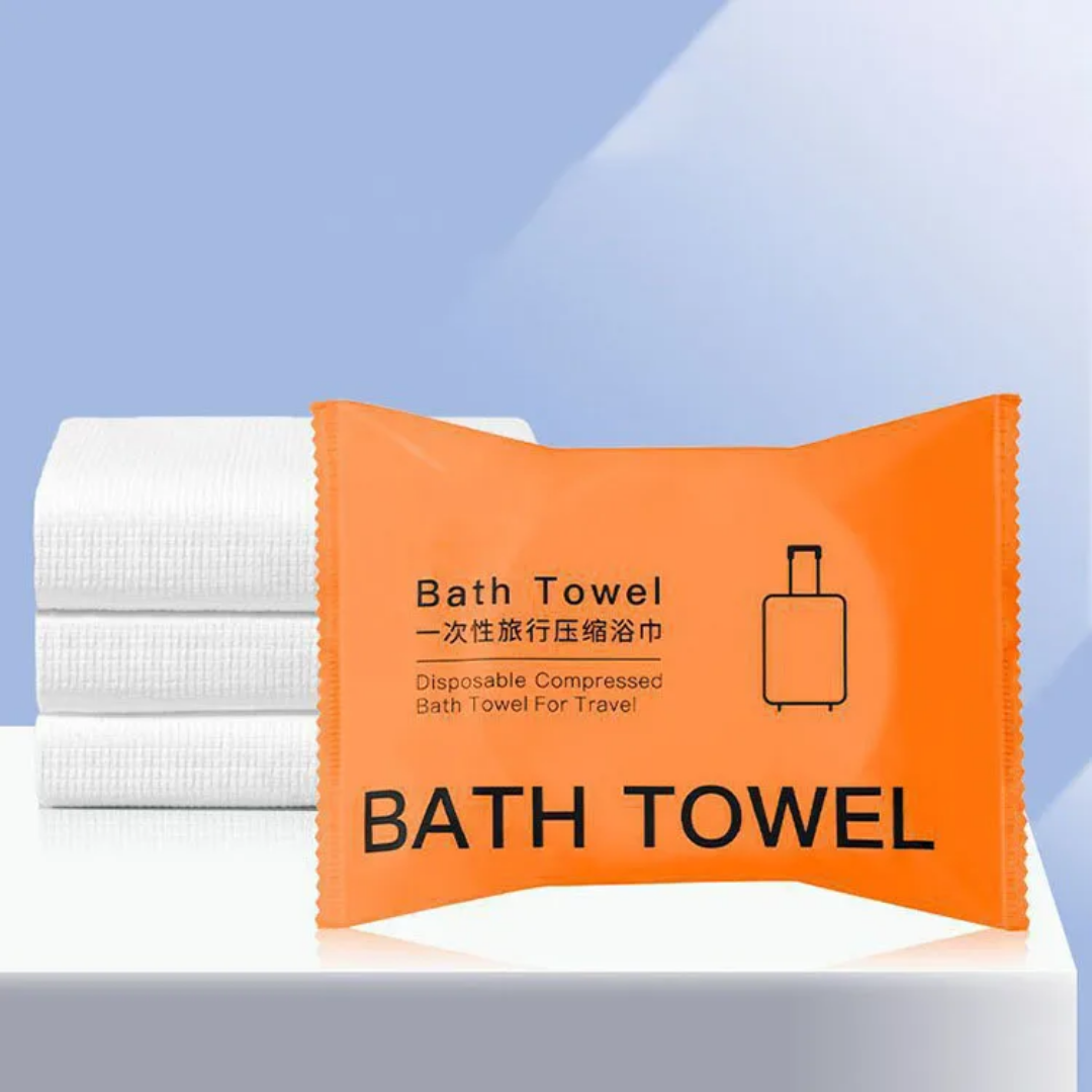 L’image montre des serviettes de bain compressées et jetables, conçues pour les voyages et les activités de plein air.