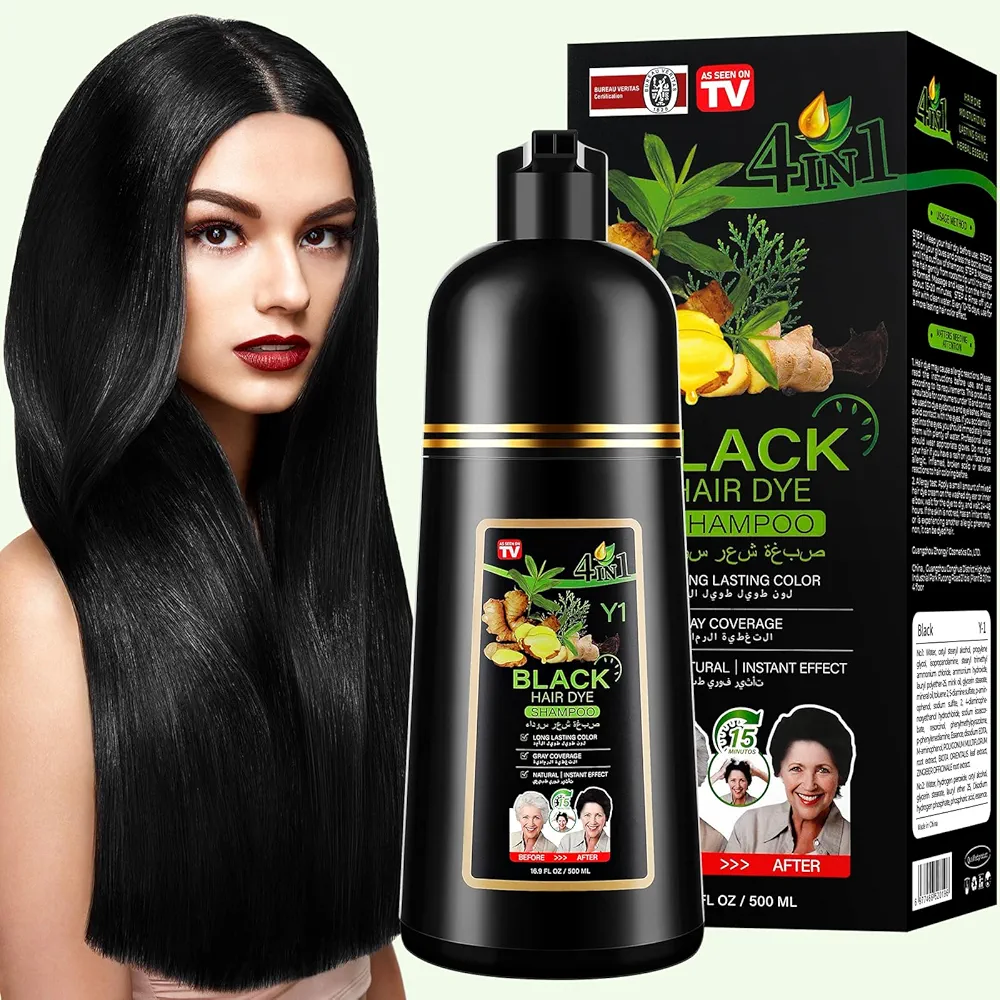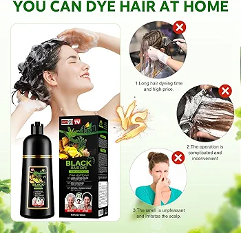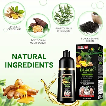 Pour le produit : Shampooing Colorant Noir 4 en 1 pour Cheveux Gris, Teinture Capillaire Naturelle Longue Durée, Couverture Optimale et Effet Instantané, Formule Herbal 500ml