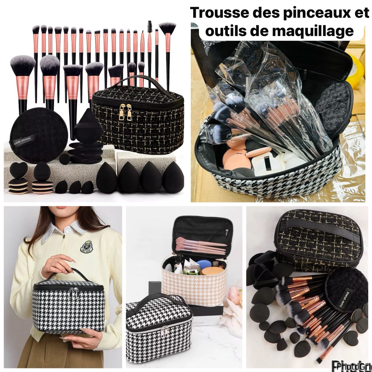 Pour le produit : Trousse Complète de Pinceaux et Éponges de Maquillage Professionnels, Kit d'Application Cosmétique pour un Teint Parfait, Rangement Organisé avec Vanity Chic Motif Pied-de-Poule, Idéal pour Visage et Yeux